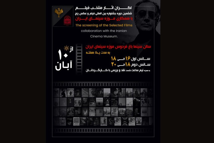 به گزارش خبرگزاری مهر به نقل از روابط عمومی جشنواره، فیلمهای منتخب ششمین جشنواره بینالمللی فیلم و عکس «پنج» از کشورهایی همچون ژاپن، ترکیه، رومانی، روسیه، چین و … قرار است از ۱۰ آبان به مدت یک هفته در ۲ سانس از ساعت ۱۶ الی ۱۸ و ۱۸ الی ۲۰ در سالن فردوس موزه سینما اکران شوند. پس از اکران هر فیلم نشست نقد و بررسی آثار با حضور برخی فیلمسازان و هنرمندان انجام میشود. حضور در اکران فیلمها و جلسات نقد و بررسی برای عموم علاقهمندان به سینما رایگان است. موسس و دبیر جشنواره مهدی شادیزاده است و اعضای اصلی شورای سیاستگذاری عبارتند از مدیر شورا ستاره اسکندری، علیرضا شادیزاده، ندا زنگنه، نیلوفر علیها، بهداد نجفی، آیدا اورنگ، مهدی شادیزاده، مدیر روابط عمومی: ندا زنگنه، دبیر اجرایی: بهداد نجفی، مدیر هنری: آیدا اورنگ، طراح گرافیک: سمیرا جوشقانی، مدیر روابط بین الملل: محمدهادی مشکی. علاقهمندان میتوانند برای دریافت اطلاعات این رویداد به سایت جشنواره به آدرس WWW.۵photoaward.com و صفحه اینستاگرام رویداد به نشانی 5filmfotofestival مراجعه کنند.